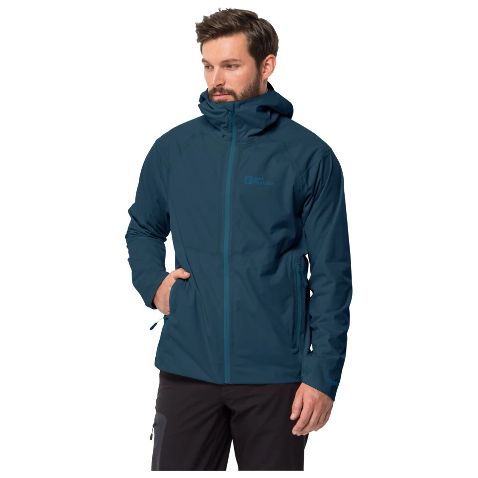 The Emberberg 3L Jacket from Jack Wolfskin is a must-have for everyday wear and hill walking. It features two large front pockets for storing away your valuables. Plus, it has a comfortable cut, so you’ll feel great during your hike or hut-to-hut tour. The jacket is equipped with an adjustable hem and elastic cuffs to keep the cold wind at bay and a brim on the hood to keep the rain away from your face. Thanks to its light weight, it will easily fit in your backpack.